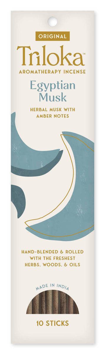 Triloka Egyptian Musk Original Incense: Sensual-Calming-Relaxing. Elegant herbal Musk scent with Amber creates the warm and gentle atmosphere for a romantic evening. Triloka incense is hand-made according to the ancient masala method, a tradition that has been passed down through incense-crafting families in India for generations. This tried-and-true process blends sandalwood, herbs, gums, woods, resins, and oils to form a paste (masala) which is then hand-rolled onto fine bamboo sticks to dry in the sun. This method creates incense with a long-lasting fragrance that leaves a subtle aroma even after the incense has gone out. 10 sticks per pack. Handcrafted in India by our valued supply partners.