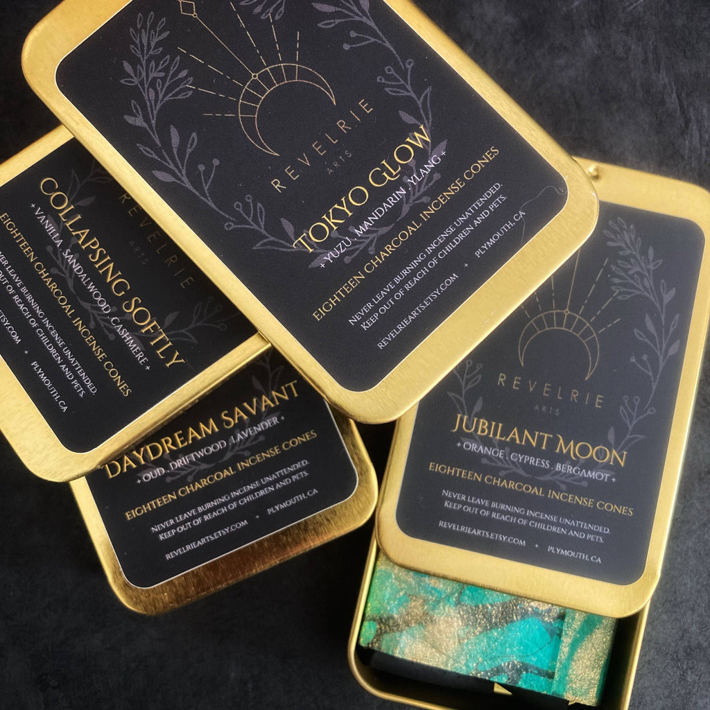 Eighteen charcoal incense cones wrapped in beautiful handmade paper and tucked into a sleek gold slide tin. Handmade papers will vary. Each cone burns approximately 20 minutes, and with a charcoal base (instead of wood), you'll experience a cleaner burn and less of the typical 'burning wood' undertone. Hand-crafted in small batches at the Revelrie Arts studio, nestled quietly in California's Sierra Foothills.