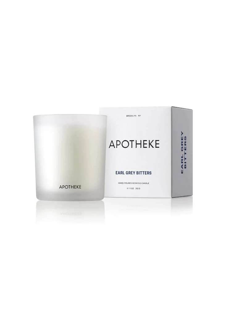 EARL GREY BITTERS: Our signature frosted glass candle fills your room with classic earl grey tea leaves blended with lemon zest, bergamot, and peony for a relaxing moment.