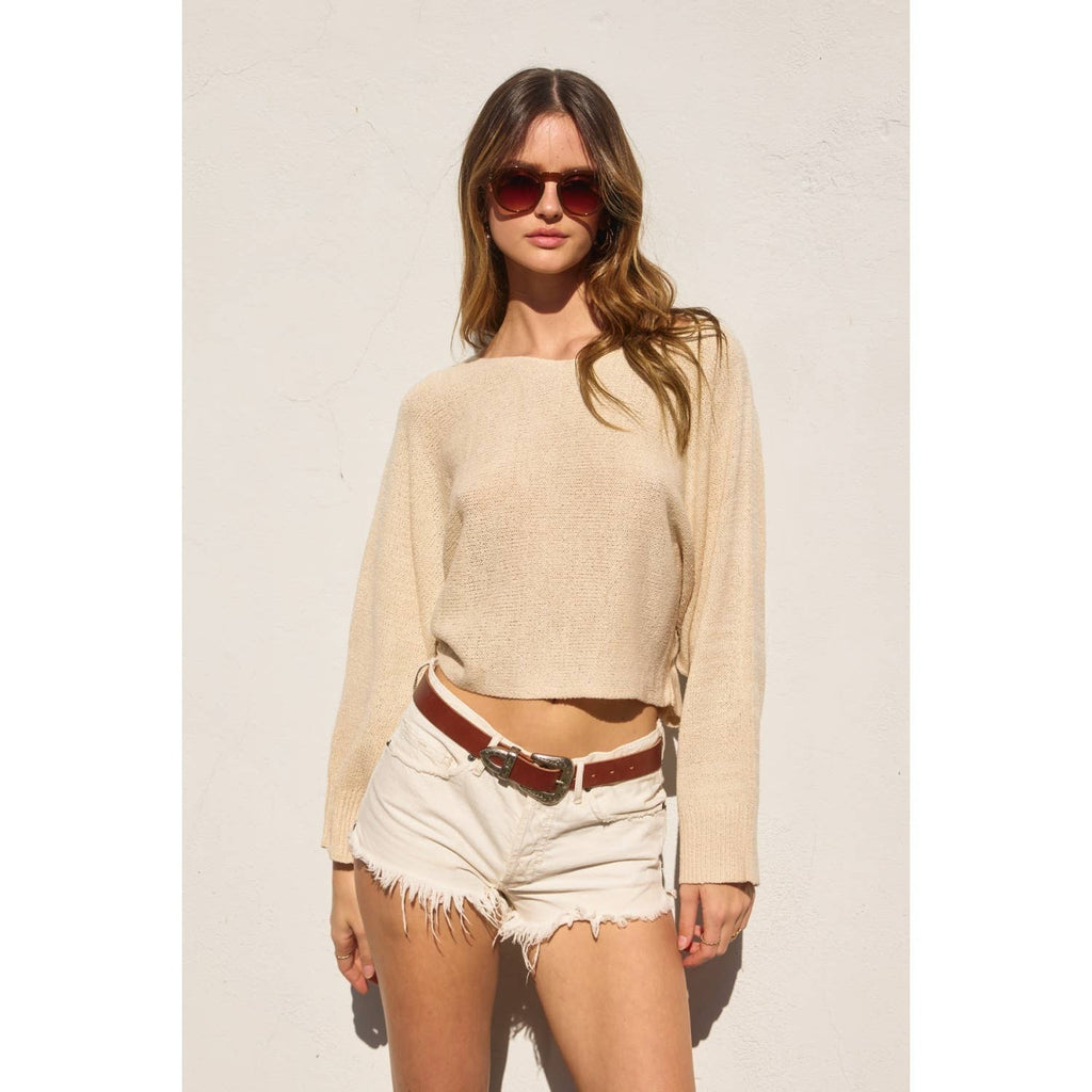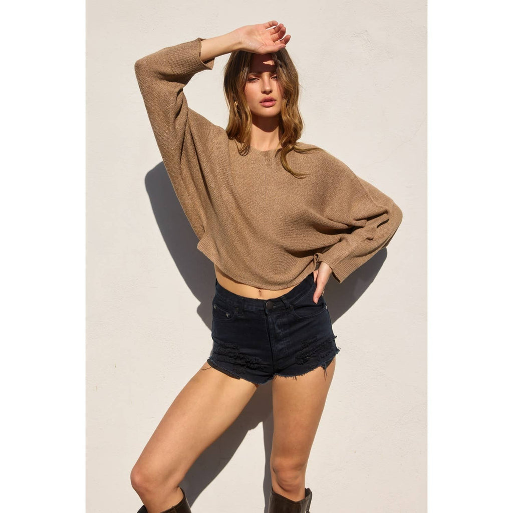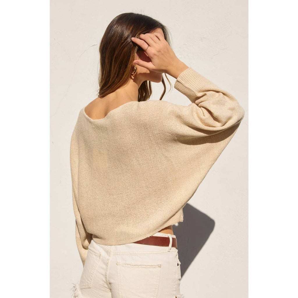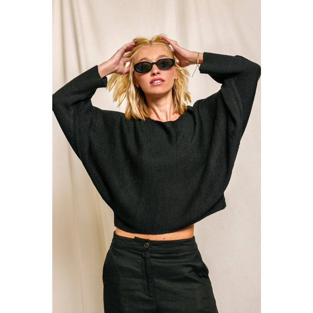 This lightweight sweater top in neutral shades is the perfect blend of comfort and style. Its relaxed silhouette and versatile design make it a staple for casual, effortless looks. Pair it with high-waisted shorts or jeans for a chic, laid-back vibe. Model in other colors is 5'9" and in BLACK is 5'7". They are wearing size Small. - Soft and breathable knit - High boat neck - Batwing long sleeves with ribbed sleeve openings - Slightly cropped length Shell: 65% Acrylic, 35% Nylon Lining: