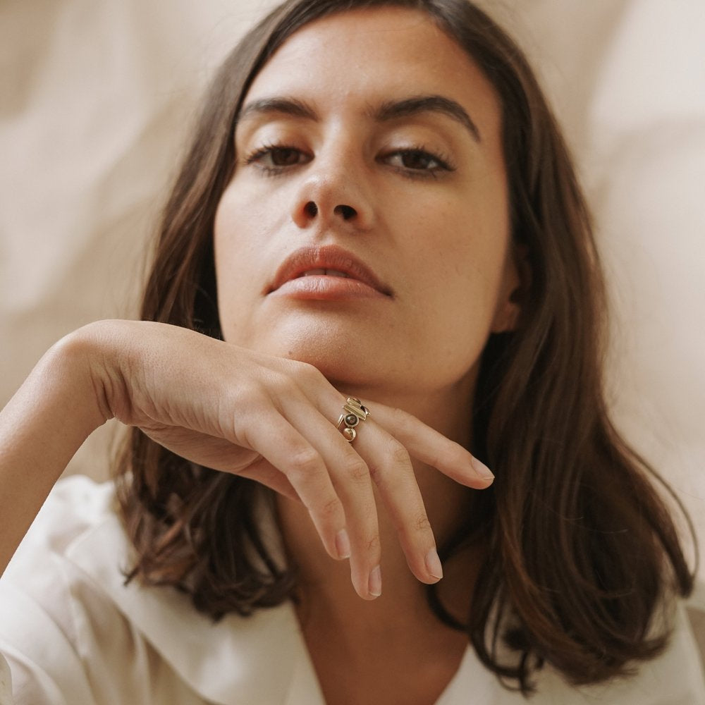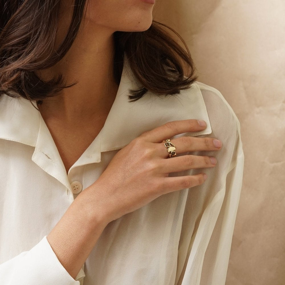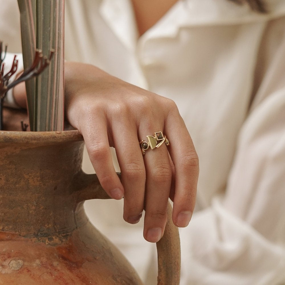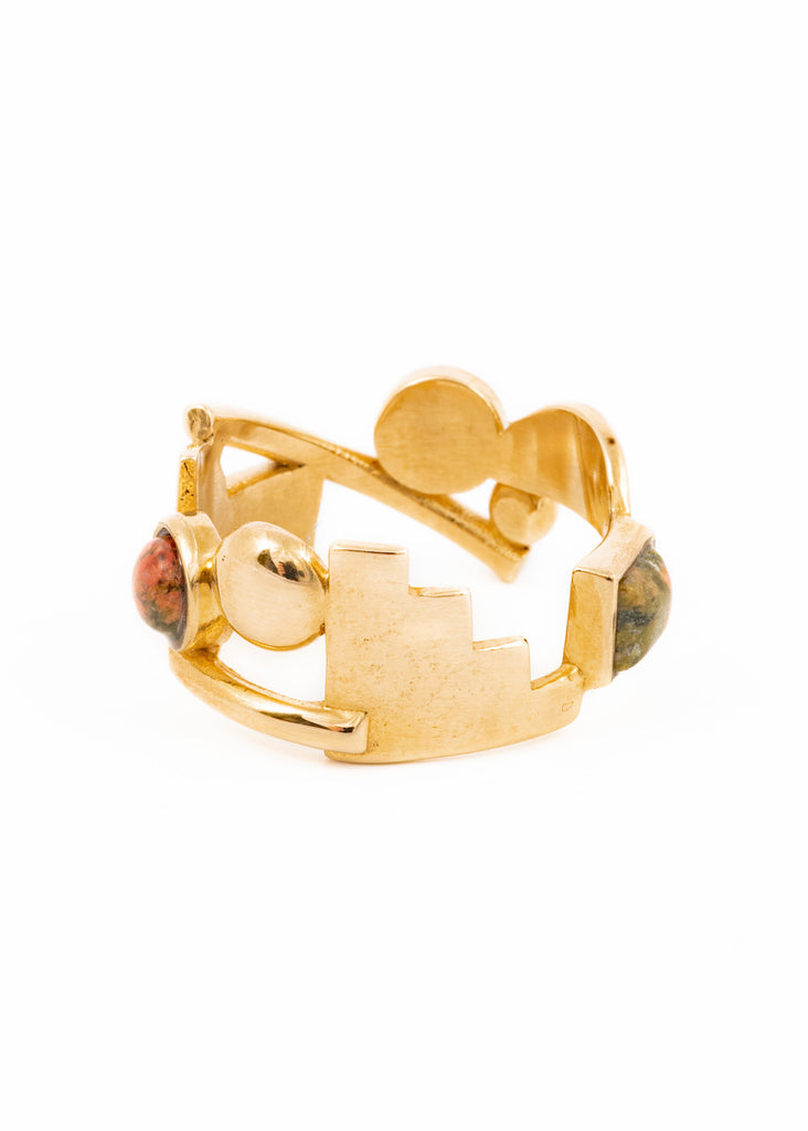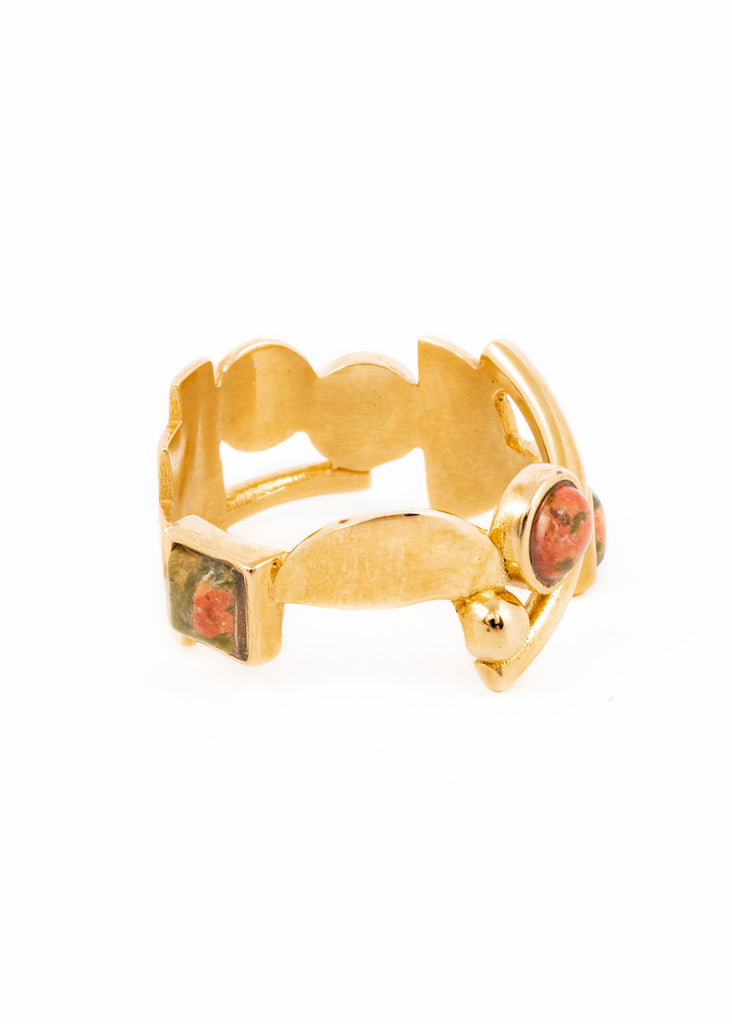 Unique and beautiful, the Lindsay Lewis Brass Shapes Ring is a must-have for any fashion-forward individual. With a collection of circle and square unakite stones wrapped around metallic semi-circle, rectangle and bar shapes, this ring is far outside the ordinary.