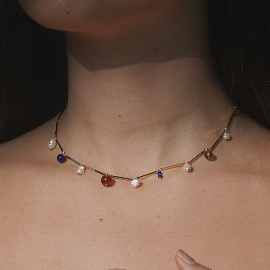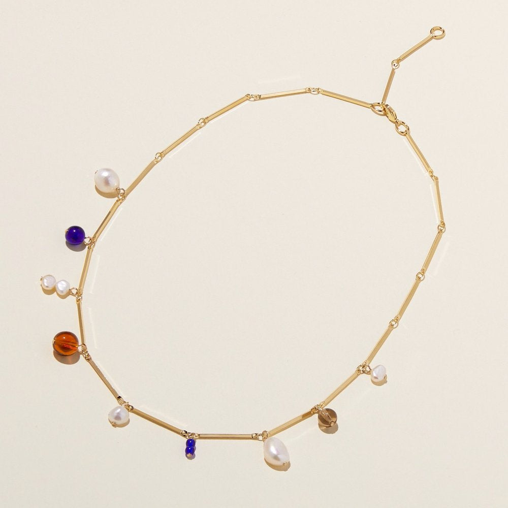 fête means celebration and this necklace will be your next party staple. sophisticated yet playful, the freeform pearls and translucent glass dangle from modern bar chain.