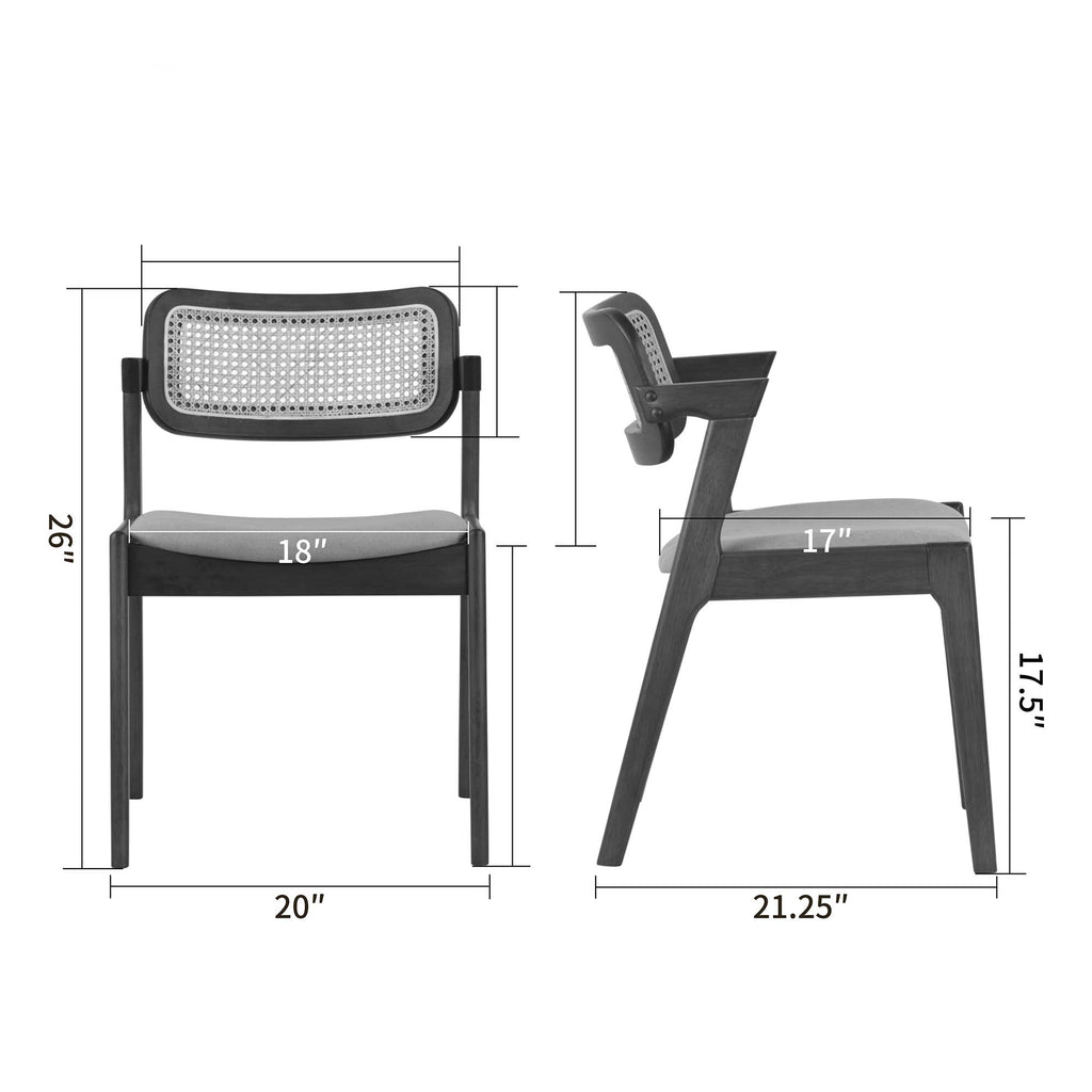 Gray Fabric Dining Chair with Rattan Back and Black Wood Legs Enhance your dining experience with this distinctive gray dining chair. Designed with a sturdy black rubberwood frame and an eye-catching rattan backrest, it offers a unique blend of elegance and charm. The chair's intriguing frame adds a touch of modern flair to your space, making it a perfect choice for those who appreciate both style and functionality. Upgrade your dining area with this exceptional chair.Product Dimensions: Overall: 20"W x 21.25"D x 26"H Weight: 12.125 LBS Seat: 18"W x 17"D x 17.5"H. Other Dimensions: Back dimensions: 18"W x 4.25"D x 9"H. Leg: 17"H..