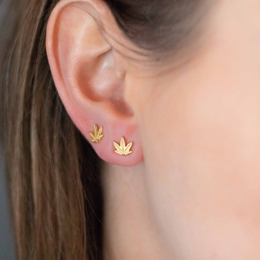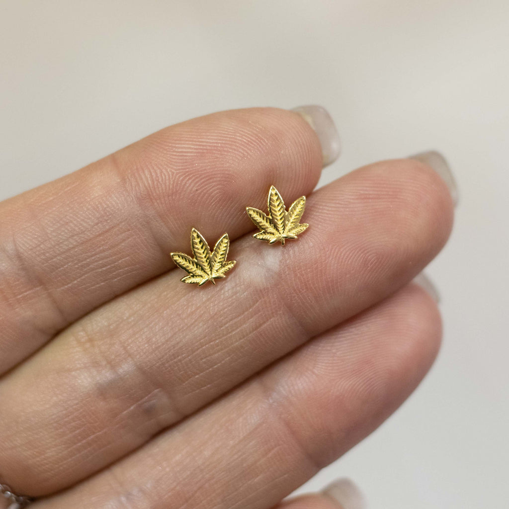This unique set of studs feature a very details marijuana leaf with 18k thick gold plating over high quality sterling silver. This set is Gold Vermeil standard, meaning it meats the criteria of 2.5 microns of 18k gold plating over sterling silver, NOT brass or bronze or some other cheap metal. Dimensions: 6mm wide, 12mm long Made in Canada!