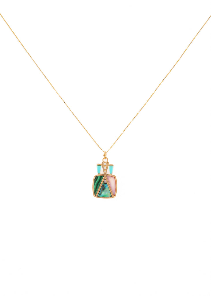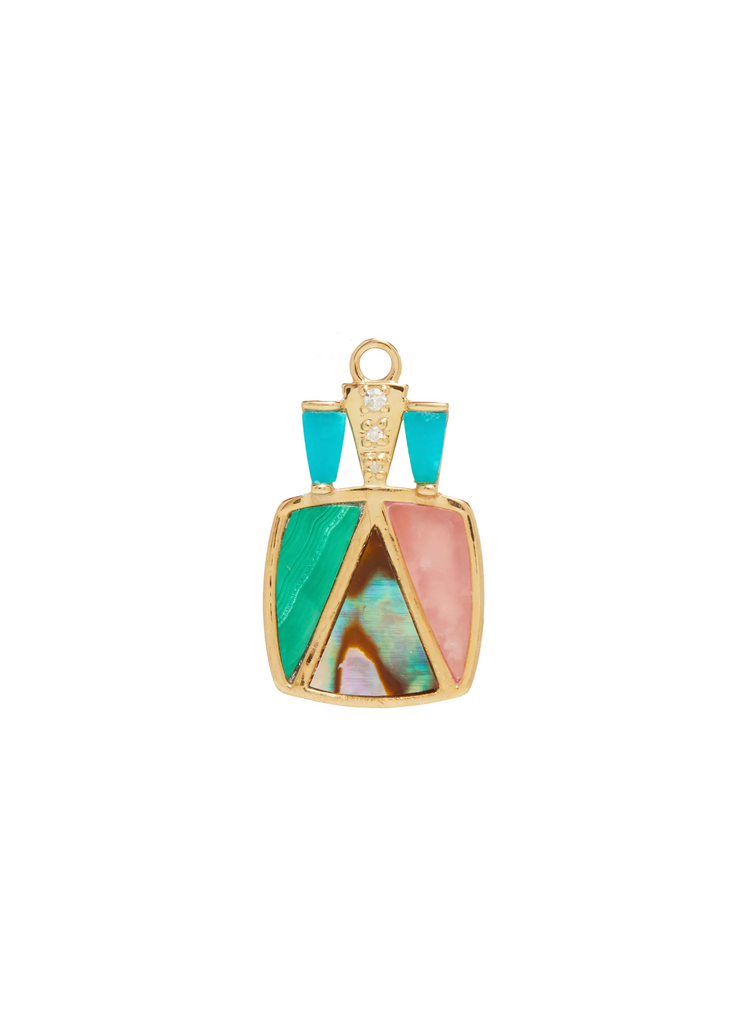 Cast from solid 14k yellow gold set with a iridescent abalone, pink opal and malachite complimented by bright American turquoise and bright white diamond accents.