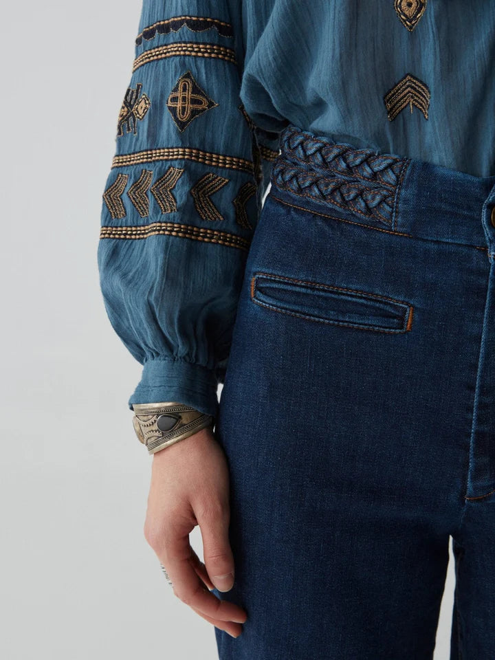 The Di Pinto di Blu Blouse isn’t just a garment; it’s a statement of fearless style. The golden embroidery shines against the deep, rich blue fabric, creating a striking contrast. The patterns woven across the front, sleeves, and back blend traditional artistry with a modern twist. Tassel accents bring a hint of playfulness.