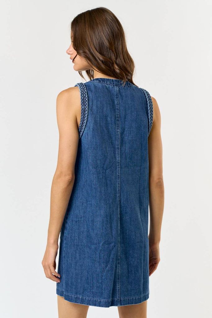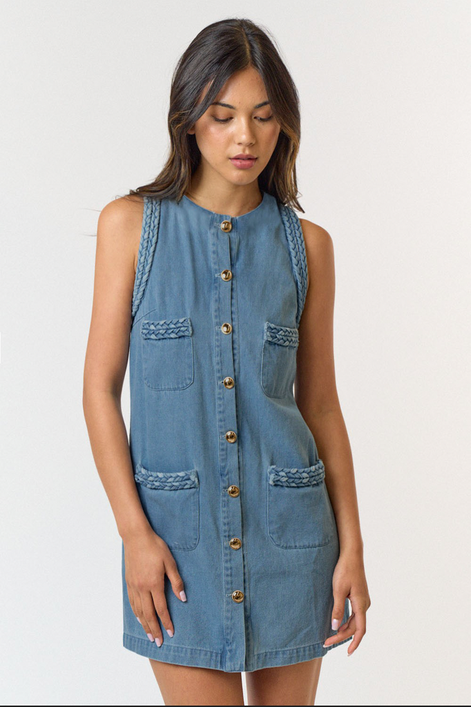 BRAIDED DENIM POCKET FRONT SLEEVELESS MINI DRESS - is backordered and will ship as soon as it is back in stock.