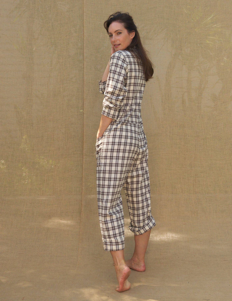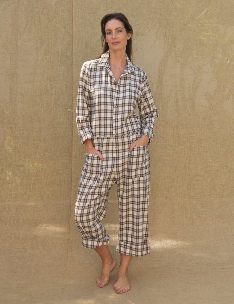 Snuggle up in the Inez, sure to be a winter staple. The Inez is an all in one jumpsuit in a soft flannel gingham plaid print. Made in an easy, loose fit, with 2 front pockets and a front button up closure. Cozy as being wrapped up in a blanket.