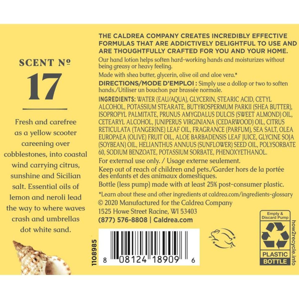 Caldrea Hand Lotion helps soften and moisturize dry, hard-working hands. The light formula, ideal for frequent application throughout the day, leaves hands soft and scented without being greasy or heavy feeling. Made with shea butter, glycerin, olive oil, aloe vera, essential oils and other thoughtfully chosen ingredients.