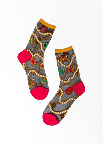 Adorn your feet with luxe pearls and vintage jewels for the holiday season. Set against a black sheer fabric, this is your go-to fancy ankle sock for pairing with dressy heels for an unforgettable holiday look.