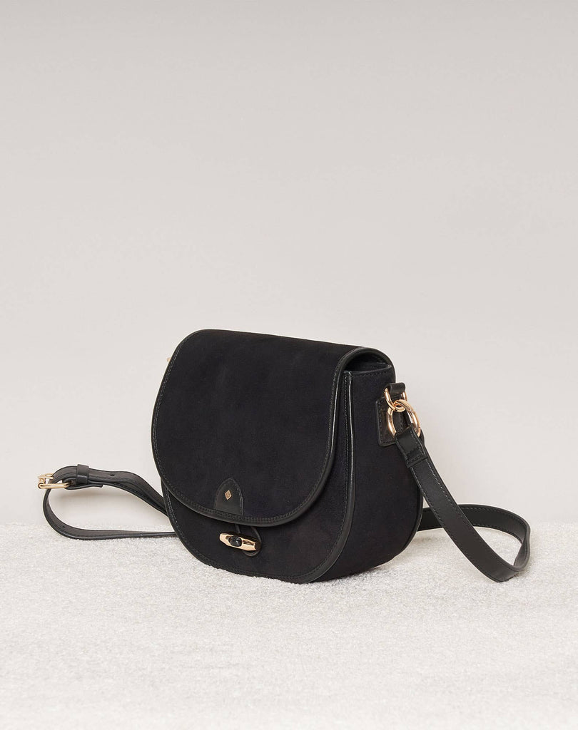 Messenger bag in black kid suede with flap and Brandenburg button closure.