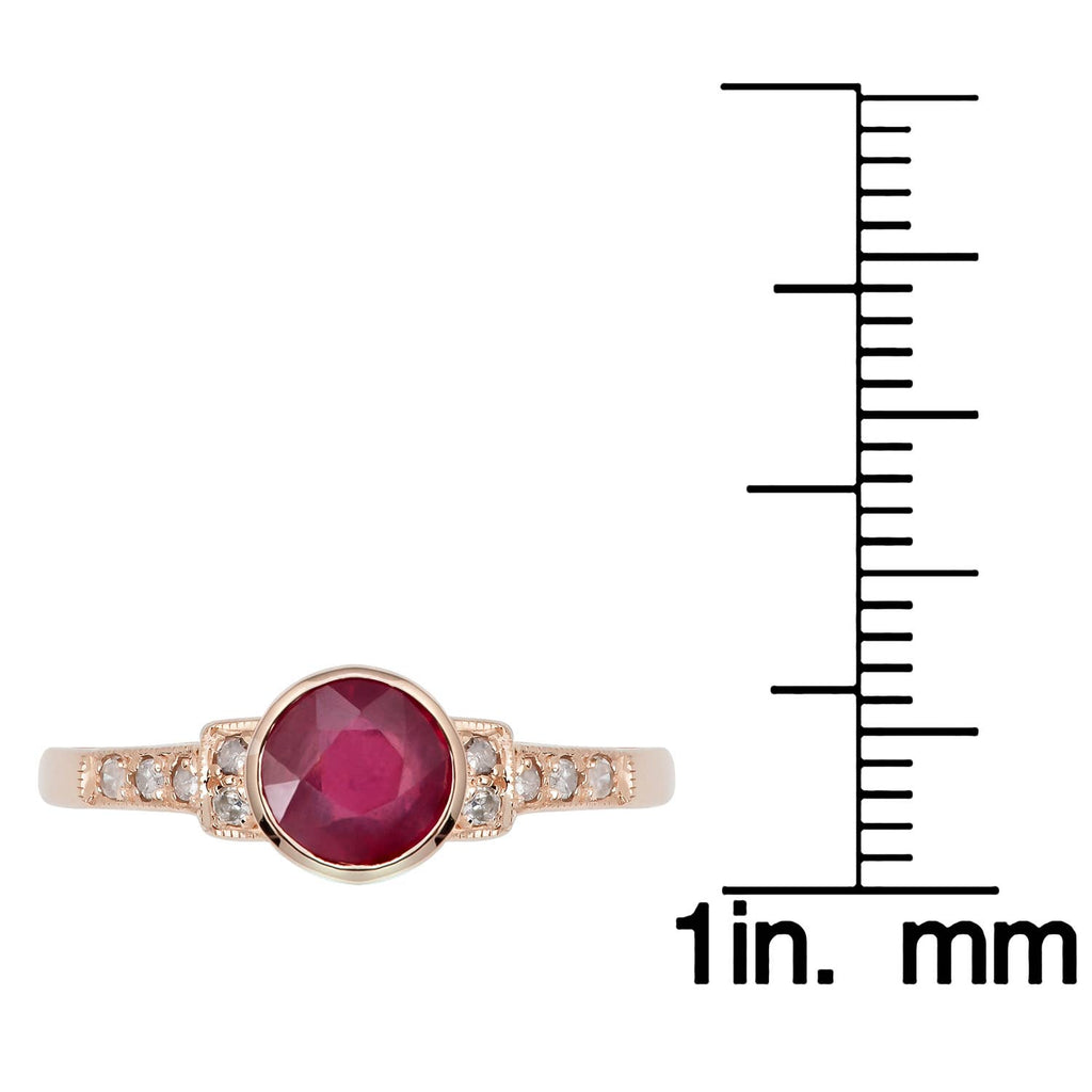 Enhance any wardrobe with this beautiful Ruby and diamond ring. This ring showcases a genuine natural 6mm round Ruby. The vintage inspired design features milgrain with pave-set diamond side stones. Crafted of 10k rose gold, this piece is a wonderful addition to your jewelry collection.