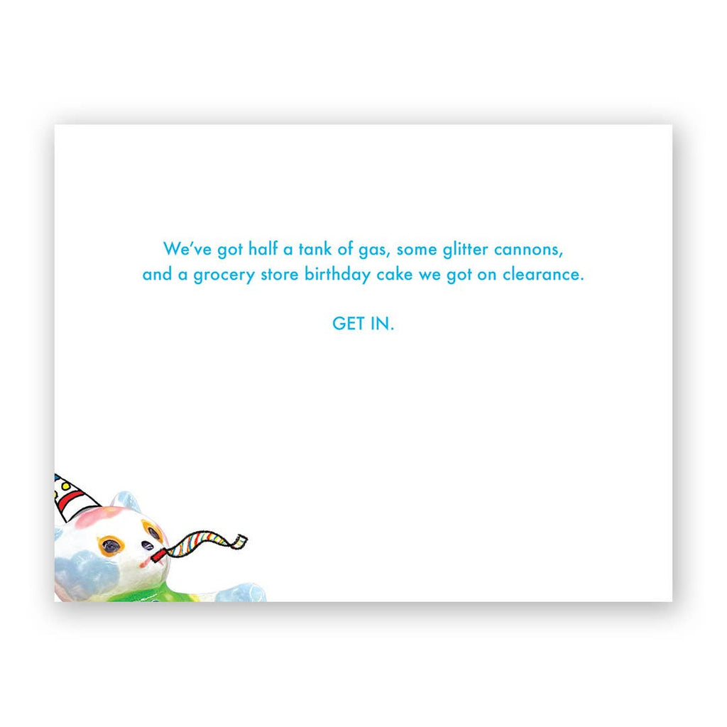Interior: We've got half a tank of gas, some glitter cannons, and a grocery store birthday cake we got on clearance. GET IN.